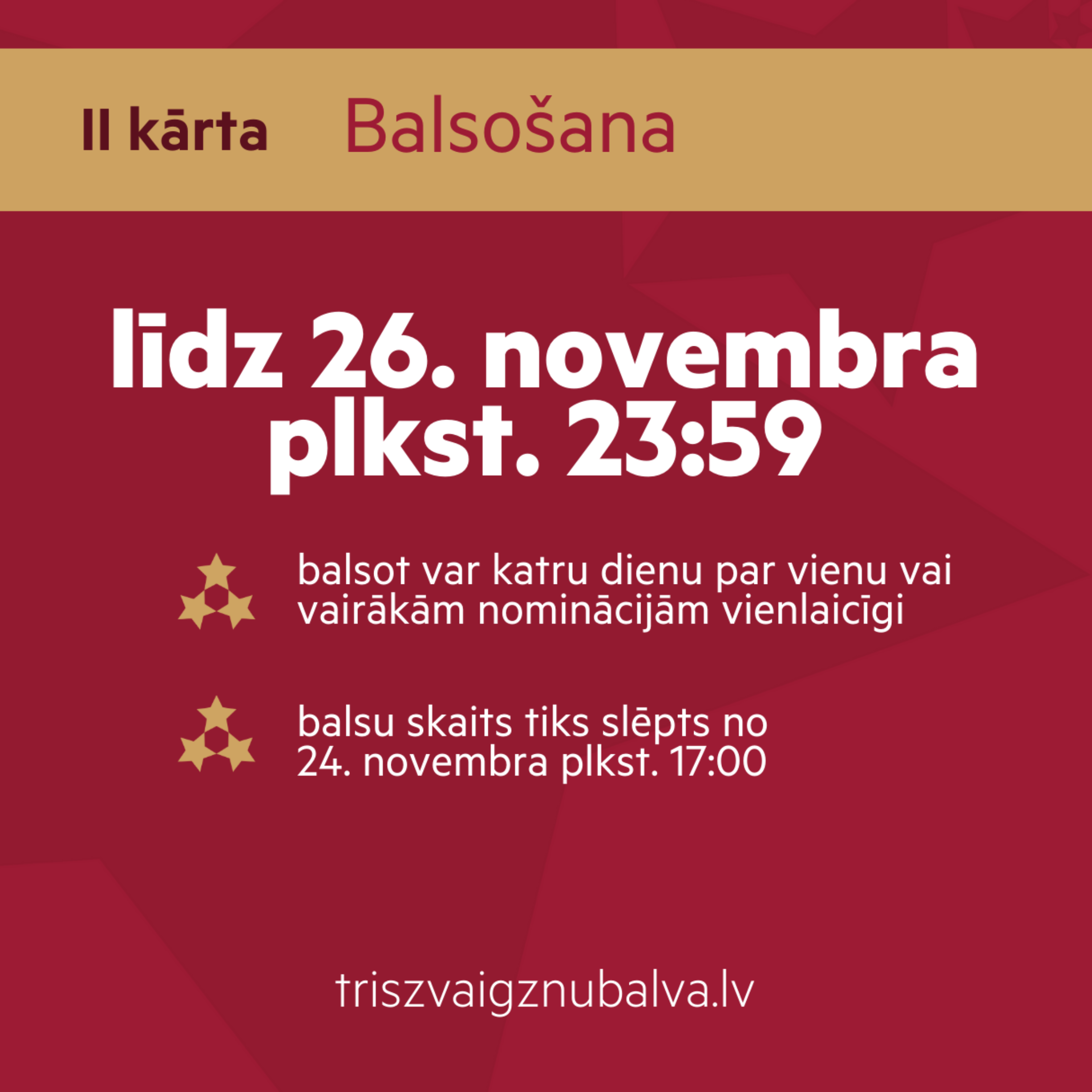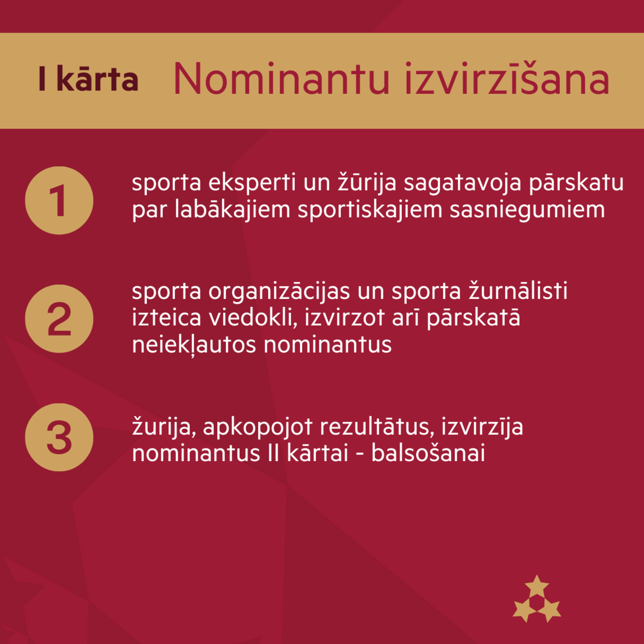 Latvijas sporta sabiedrība uzsākusi gatavošanos Trīs Zvaigžņu balvai 2025, kas ik gadu godina izcilākos sportistus, trenerus, komandas un sporta atbalstītājus. Līdz 26. novembrim turpinās Tautas balsojums vietnē triszvaigznubalva.lv, kur balsot iespējams vienu reizi dienā, izvēloties vienu, vairākas vai visas nominācijas. Lai piedalītos, nepieciešama autorizācija ar Latvijā reģistrētu tālruņa numuru.