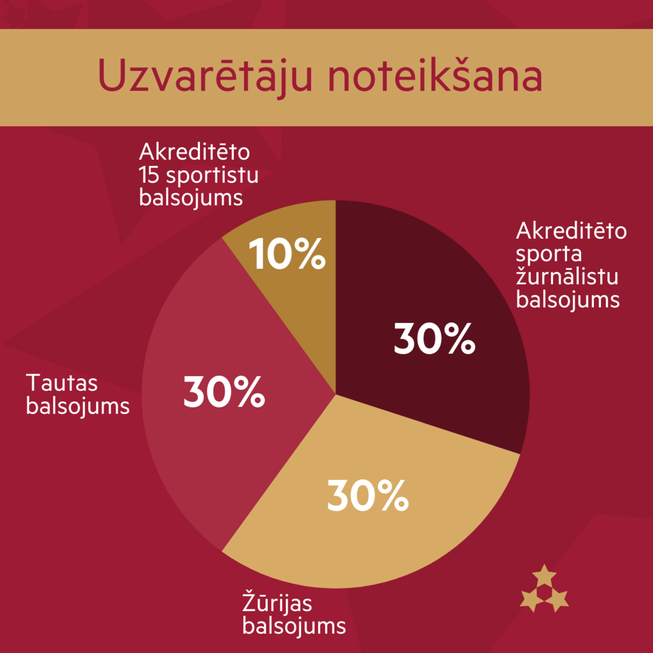Uzvarētāji tiek noteikti, apvienojot četrus neatkarīgus balsojuma komponentus: žūrijas balsojums — 30%, tautas balsojums — 30%, akreditēto sporta žurnālistu balsojums — 30%, 15 sportistu balsojums — 10% (sportistus izvirza LOK, LPK un LSFP). Lai saglabātu intrigu tautas balsojums tiek slēgts divas dienas pirms balsojuma beigām, šajā gadījumā 24. novembra plkst. 17.00.